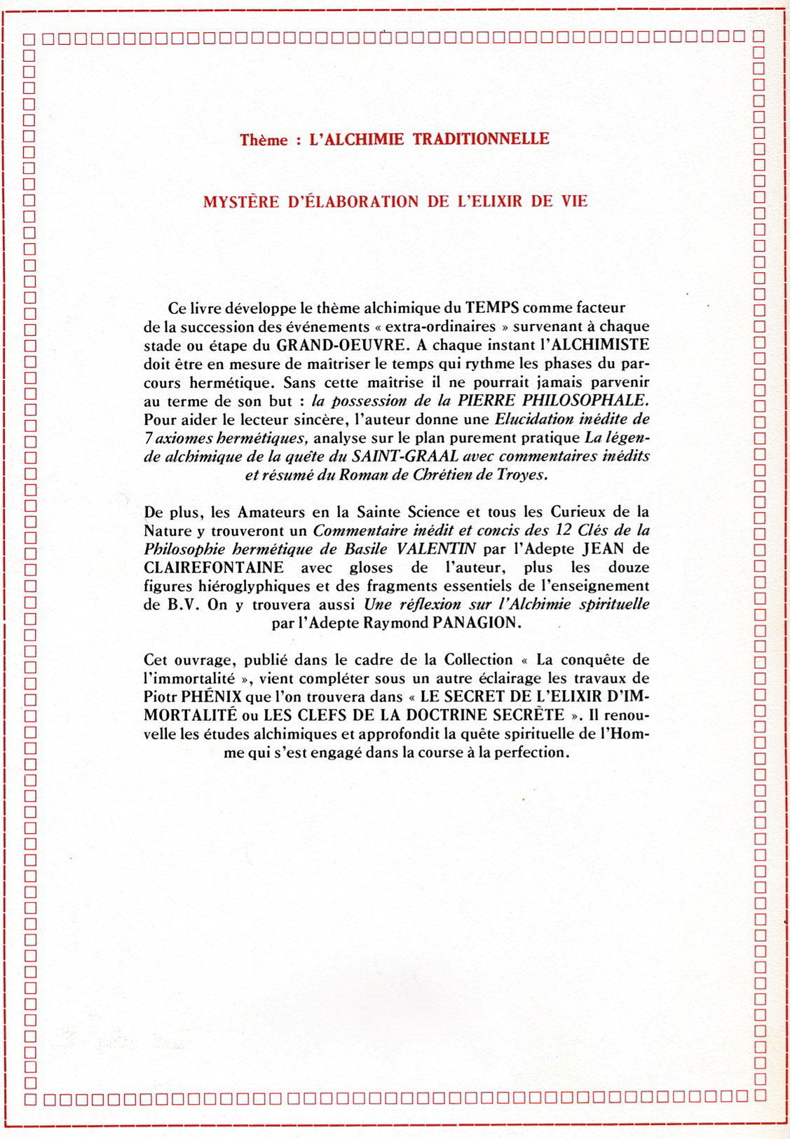 L’ouvrage inclut 4 autres ouvrages hermétiques : 1)  Elucidation inédite de 7 axiomes hermétiques ; 2) Légende alchimique de la Quête du Saint-Graal ; 3) Commentaire inédit sur les 12 clefs de la Philosophie de Bazile Valentin par Jean de Clairefontaine avec gloses de Piotr Phénix ; 4) Une réflexion sur l’Alchimie spirituelle par Raymond Panagion (alias Mgr Armand Toussaint, anciennement Patriarche de l’Eglise apostolique rosicrucienne en Belgique).